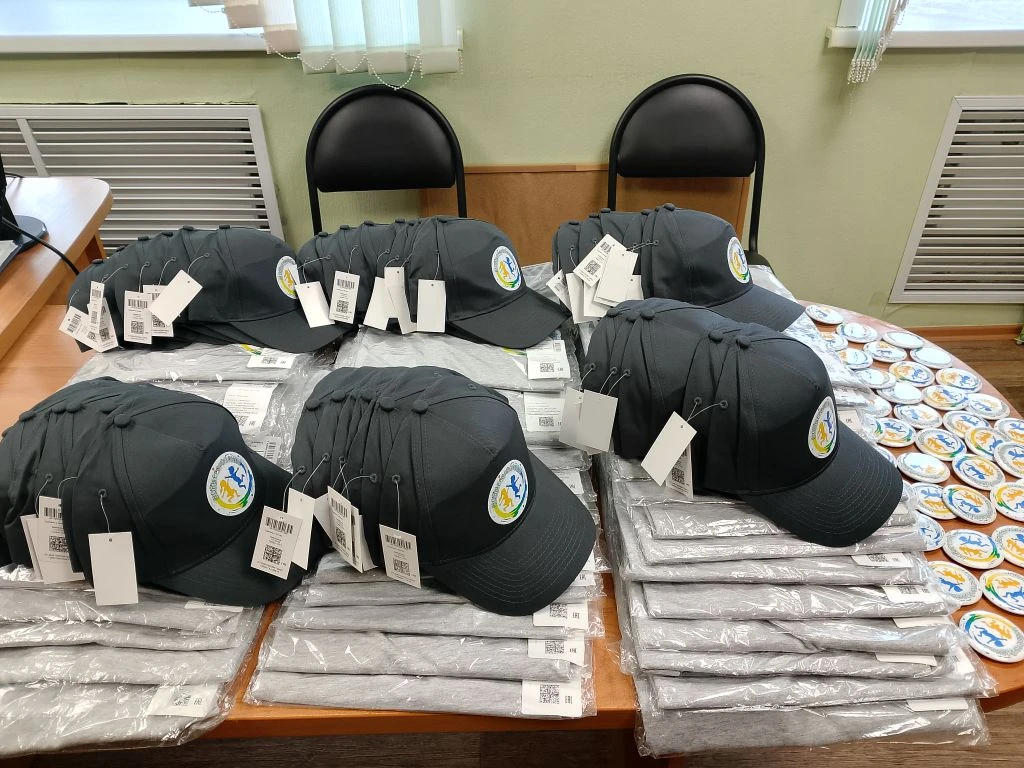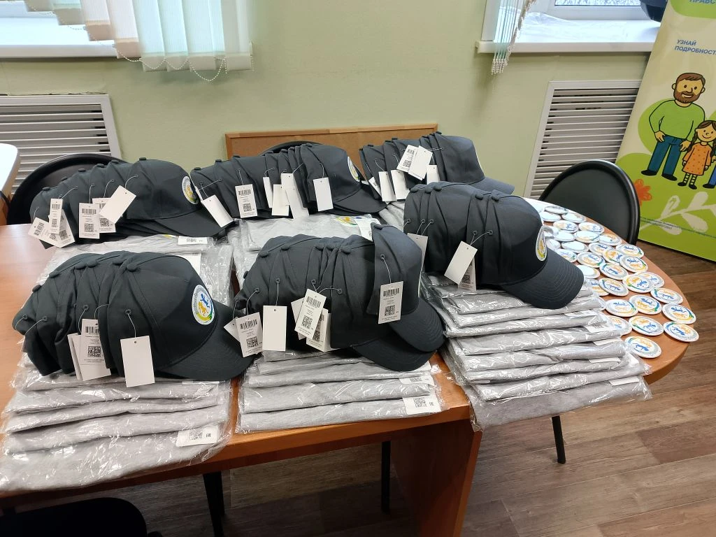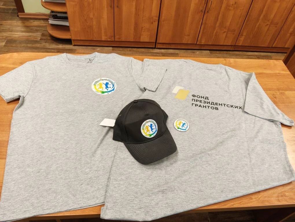Получили долгожданные 40 комплектов брендированных футболок, кепок и значков с символикой проекта и Фонда президентских грантов.